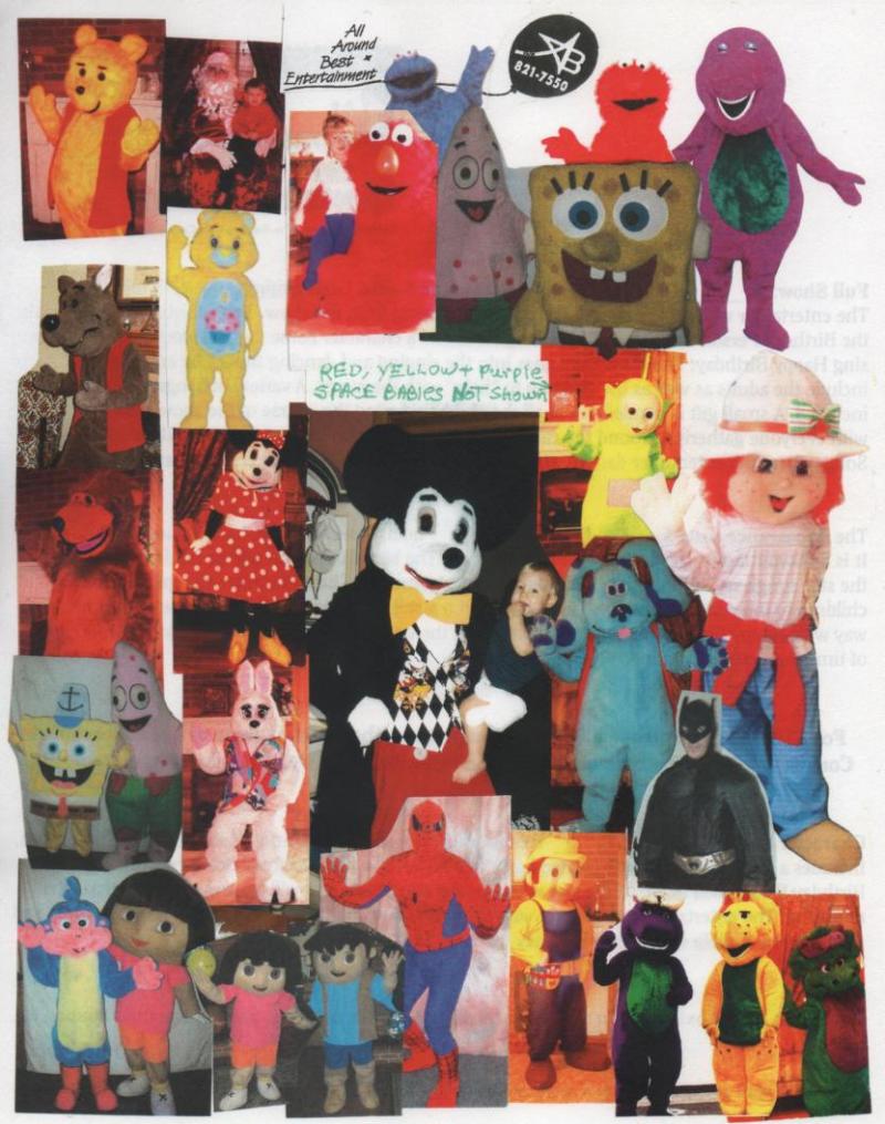 We offer no characters from TV or Film. We only have professional theatrical costumes. It is not our intention to violate any copyright laws. The characters that we offer are NOT name brand copyrighted characters. We do not have winnie the pooh, scooby doo sponge bob or patrick, not dora, boots or diego. No mickey mouse or minny mouse. Not elmo or cookie monster. No teletubbies, barney, babybop or bj either. No blues clues, strawberry shortcake or bob the builder. Not even spiderman or batman or a care bear. The characters that we have are of our own creation. Any resemblance to nationally known copyrighted characters is strictly incidental and unintentional. If you have any questions regarding this issue, we encourage you to contact us. Should you have the need for a licensed, copyrighted character at your event, we encourage you to contact the company/copyright holders for your specific targeted character. In addition, we will only accept bookings from individuals who are aware that we do not represent any licensed birthday party character, nor represent them by their licensed name."